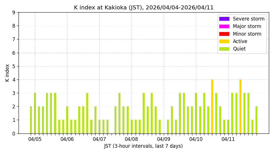 ※3時間ごとのK指数(JST, 過去7日分)。色分けはNICTのアラートレベルに準拠。