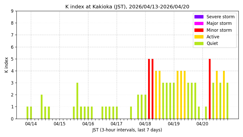 ※3時間ごとのK指数(JST, 過去7日分)。色分けはNICTのアラートレベルに準拠。