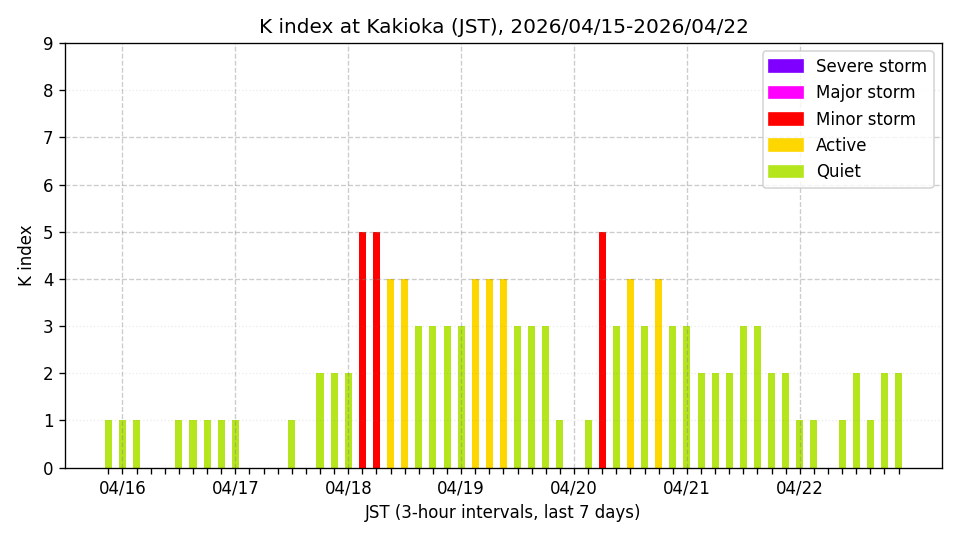 ※3時間ごとのK指数(JST, 過去7日分)。色分けはNICTのアラートレベルに準拠。