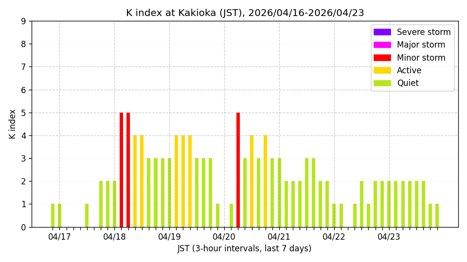 ※3時間ごとのK指数(JST, 過去7日分)。色分けはNICTのアラートレベルに準拠。