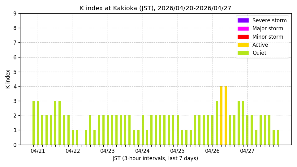 ※3時間ごとのK指数(JST, 過去7日分)。色分けはNICTのアラートレベルに準拠。