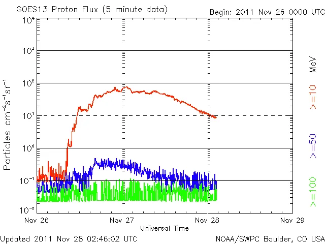 昨日警戒レベルを大幅に超えた太陽放射線は、現時点でもやや高い状態が続いているようです。