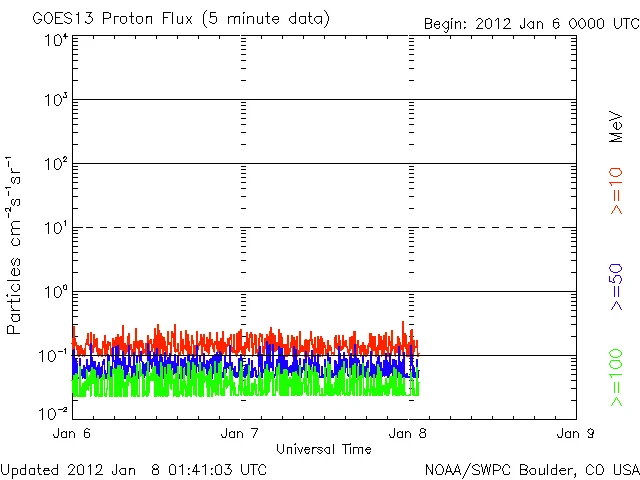 静止軌道電子(GOES)は、>=2MeVのラインも>=0.8MeVのラインもやや乱れがちに上下を繰り返しています。