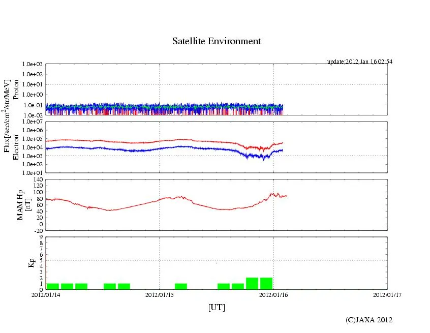 JAXAのETS8 MAMリアルタイム観測データの地球方向のデータがフラットになってきました。DRTS ETS8 KP リアルタイムグラフ表示機能のElectronには少し乱れが見られます。
