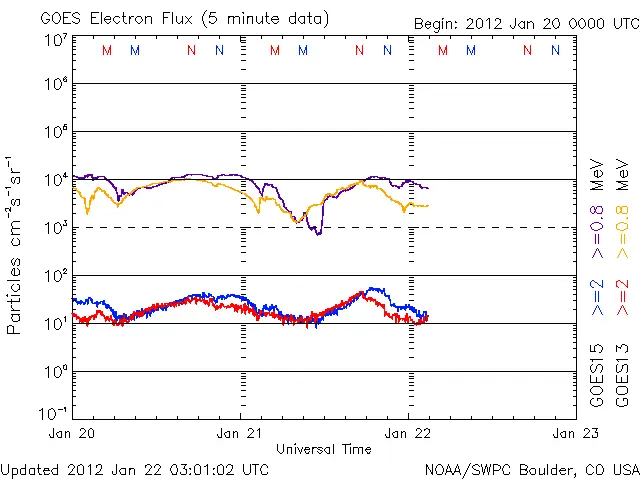 >=2MeVのラインは21日15時くらいに底辺まで下がった後上昇し、21時3時頃にピークを迎えた後、下降しています。(12時現在では上昇に転じた模様)。>=0.8MeVも同様な動きをしています。