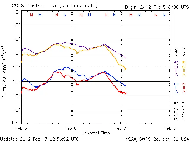 少し乱れがちです。2/6 21時頃から下降し、GOES13の>=2MeVのラインは、10の1乗あたりまで下がってきています。