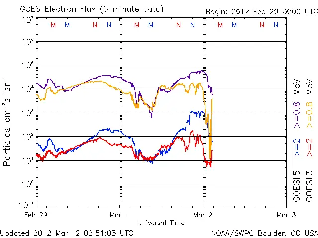 2日3時くらいから、やや乱れがあります。GOES13のラインは急激な落ち込みがあります。