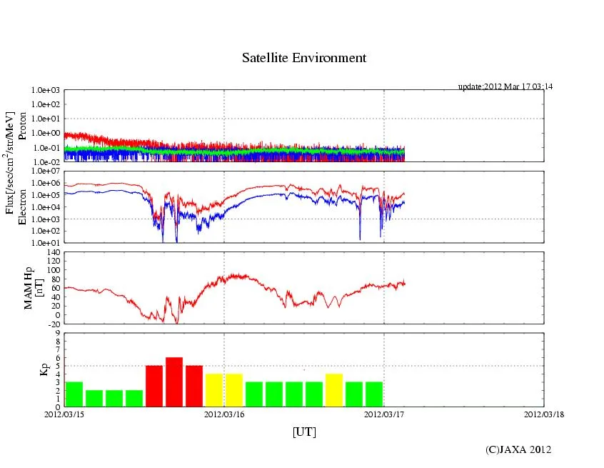 ※JAXAのETS8 MAMリアルタイム観測データのチャートは1目盛り=6時間なので、かなり見づらいです。時間の誤差に注意