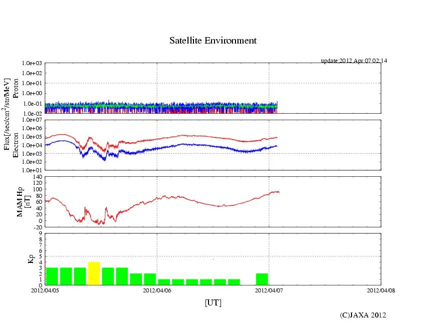 ※JAXAのETS8 MAMリアルタイム観測データのチャートは1目盛り=6時間なので、かなり見づらいです。時間の誤差に注意