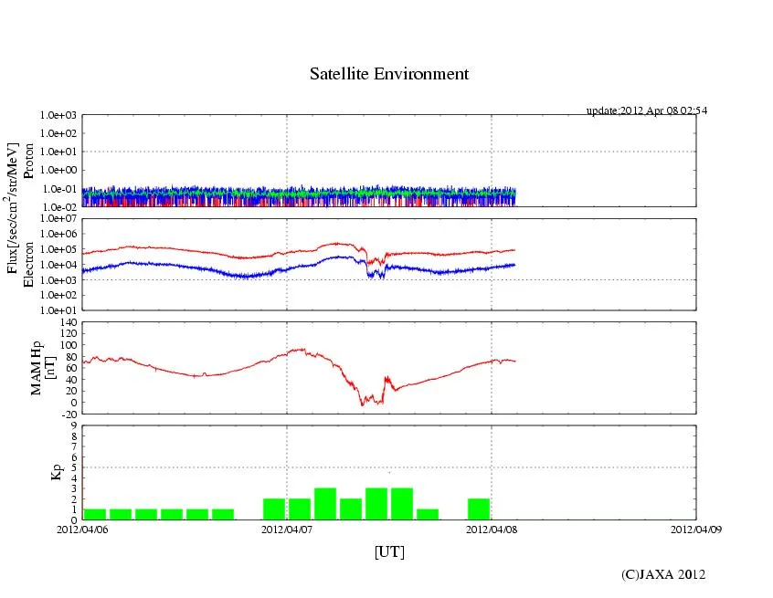 ※JAXAのETS8 MAMリアルタイム観測データのチャートは1目盛り=6時間なので、かなり見づらいです。時間の誤差に注意