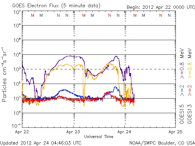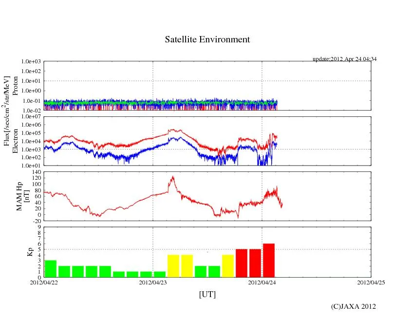 ※JAXAのETS8 MAMリアルタイム観測データのチャートは1目盛り=6時間なので、かなり見づらいです。時間の誤差に注意