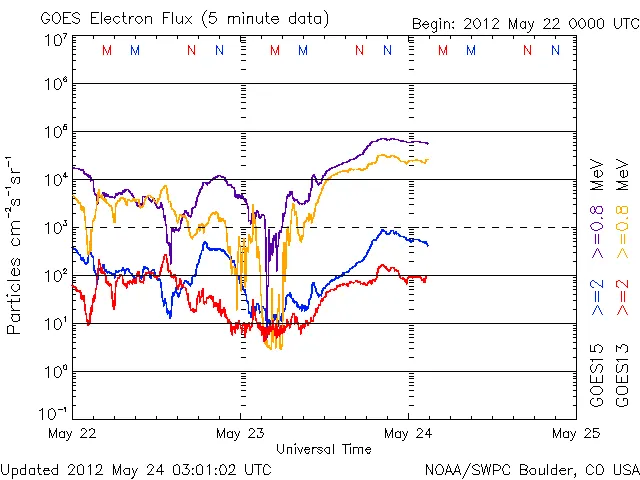 ※JAXAのETS8 MAMリアルタイム観測データのチャートは1目盛り=6時間なので、かなり見づらいです。時間の誤差に注意