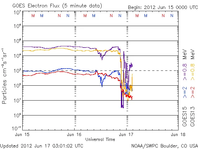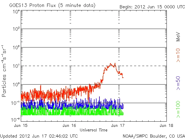 >=10MeVのラインはいつもよりやや高めに推移していましたが、今朝未明くらいから急激に上がりました。6時くらいからは下降傾向にあります。
