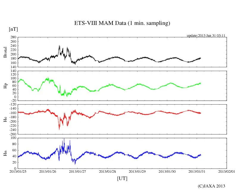 ※JAXAのETS8 MAMリアルタイム観測データのチャートは1目盛り=6時間なので、かなり見づらいです。時間の誤差に注意