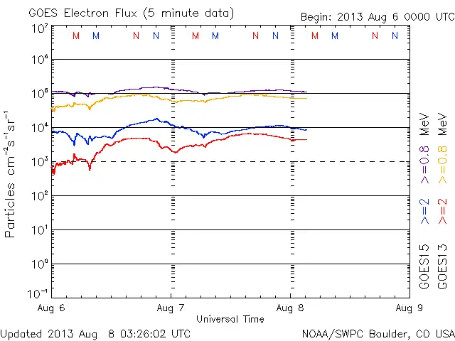 携帯の方で本BLOGからのリンクではチャートが見づらい場合はリーマンさんの記事内にある「注意報まとめ」のリンクをたどるとポリポリさんが作成されたページに飛べます。このページ内に【ETS8静止軌道磁場】がありますので、こちらをクリックするとポリポリさんが作成された「携帯でも見られるグラフ」をご覧いただけると思います。(ポリポリさん、いつもお疲れ様でございます。ぺこり)