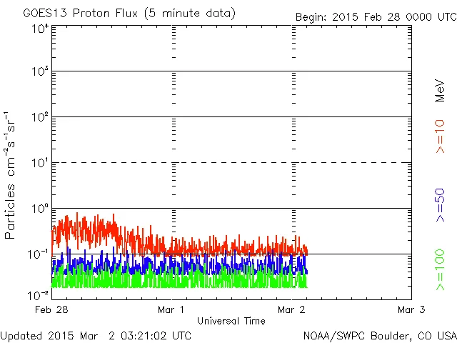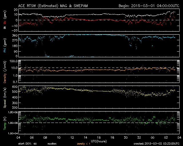 磁場は、一時フラットに近かったのですが、03/01 20時(UT)以降は南北に振れています(振れ幅は小さ目)。