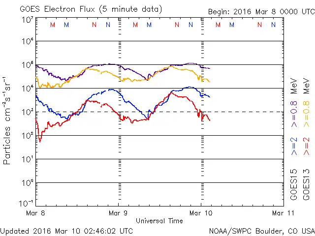 所々小さな反応が出ていて、03/09 23時(UT)くらいには少し乱れがありましたが、大きな反応等はありません。全体的なレベルはやや高め。