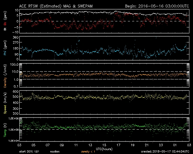 やや幅のあるラインが続いていて、05/16 13~18時(UT)くらいにかけて少し乱れがありました。