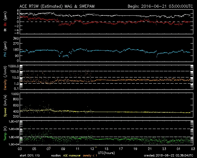 一時的に突風のような風が吹いています。太陽風の速度は少し下がり、現在は360km/s前後で推移しています。
