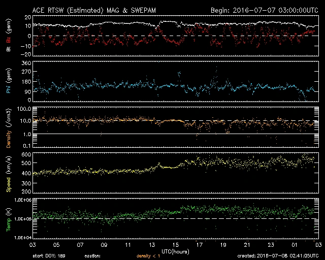 概ね穏やかな推移でしたが、07/07 08時(UT)くらいから乱れ始め、何か所か強い反応が出ています。