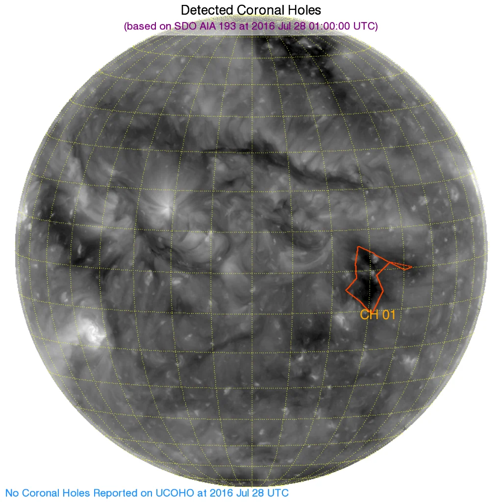 ※南半球東端のコロナホールはやや縮小しながら西側へ移動。こちらの影響が29日頃から届くかも。