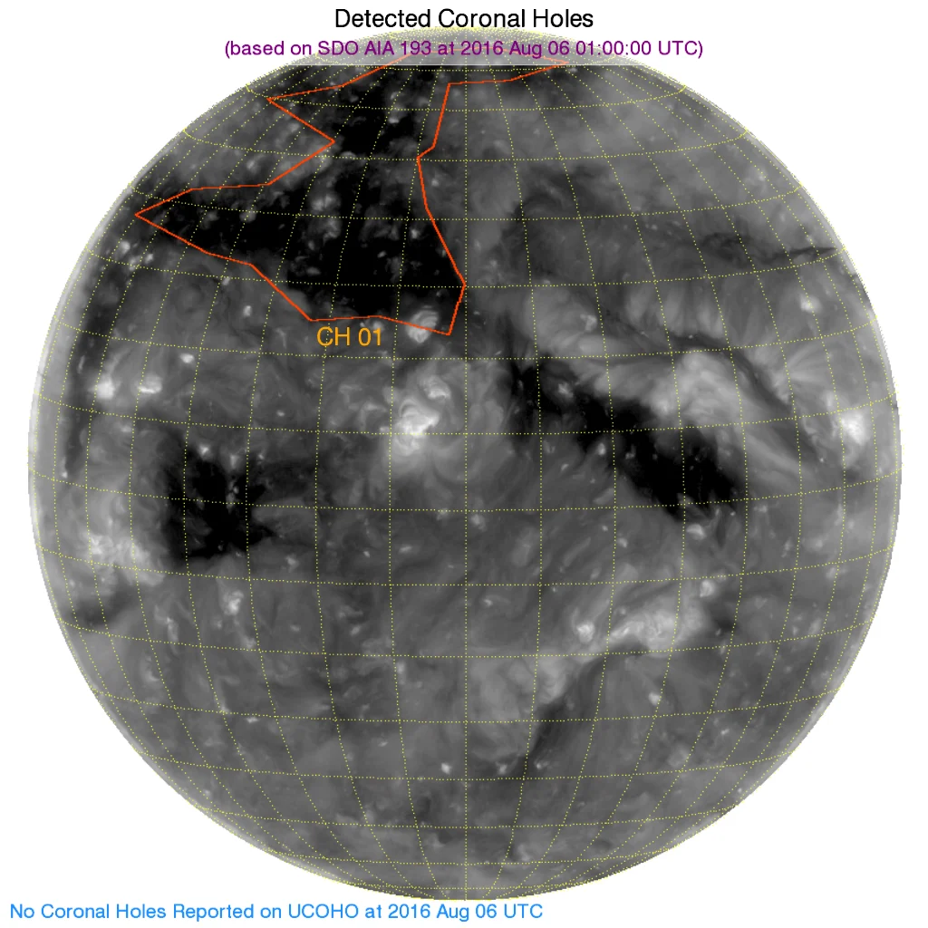 北の極のコロナホールは正面に差し掛かってきました。現在赤道付近にあったコロナホールの影響下な模様。