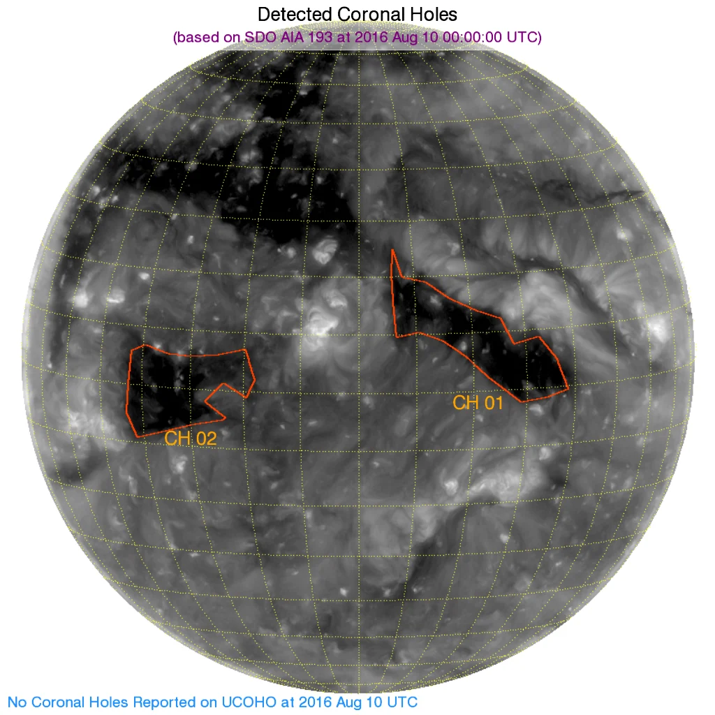 ※北の極にあったコロナホールは消滅。赤道付近の西寄りと南半球東側にコロナホールがあります。