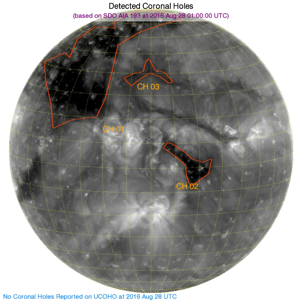 ※南半球正面のコロナホールは西寄りへ移動。こちらの影響は30日くらいから届くかも。
