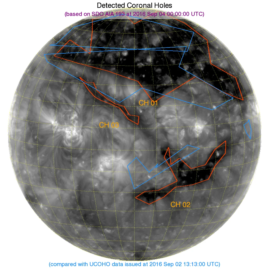 ※北の極に巨大なコロナホールがあります。一部分離して北半球正面付近に細長いものがカウントされています。