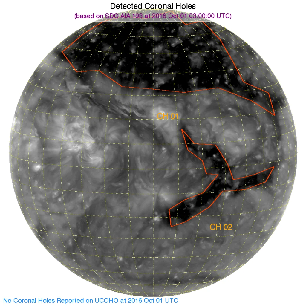※コロナホールが2つに分かれました。→北の極と南半球西寄り。北の極のコロナホールは巨大です。