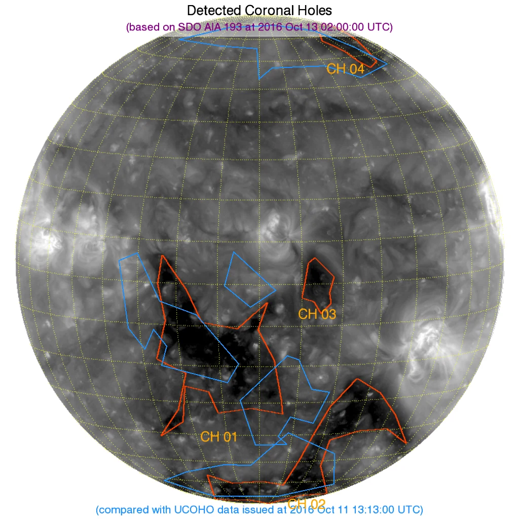 南の極のコロナホールは更に発達しながら正面へ移動。北の極のコロナホールは縮小し、西側へ移動。