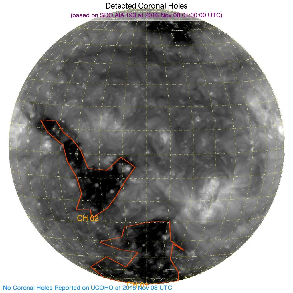 南半球東側のコロナホールは、やや発達。こちらの影響は11日頃から届き始めるかも。