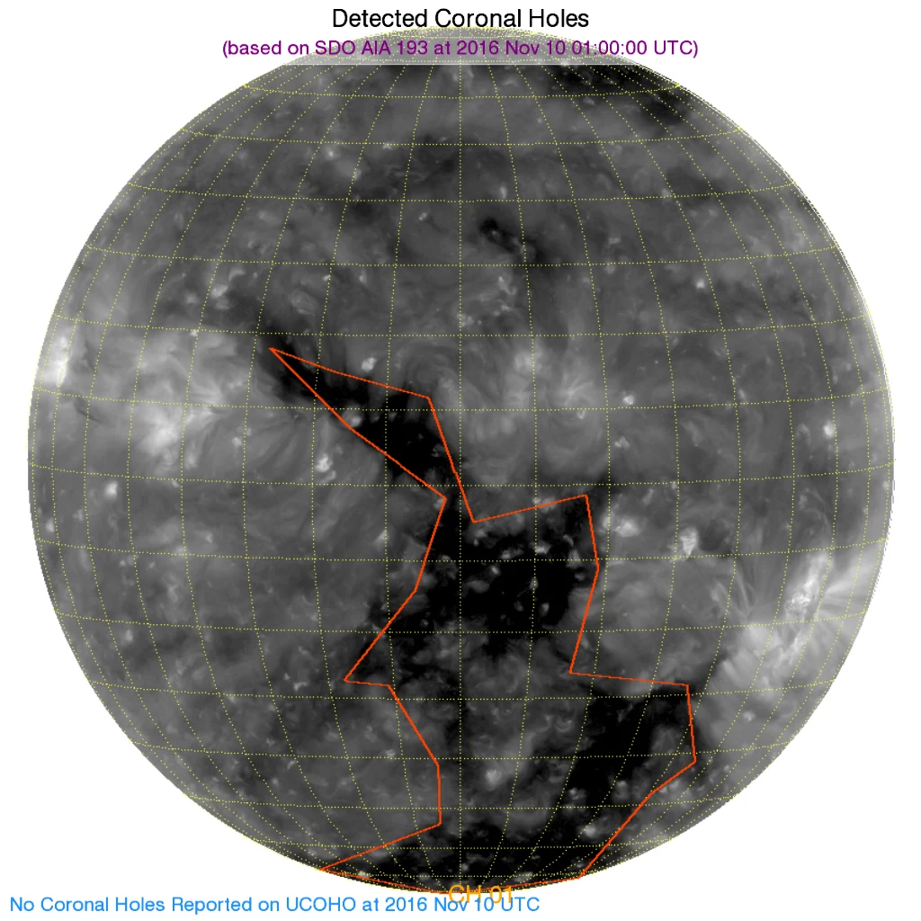 正面付近、南半球から北半球東寄りにかけて広がる巨大なコロナホールがあります。