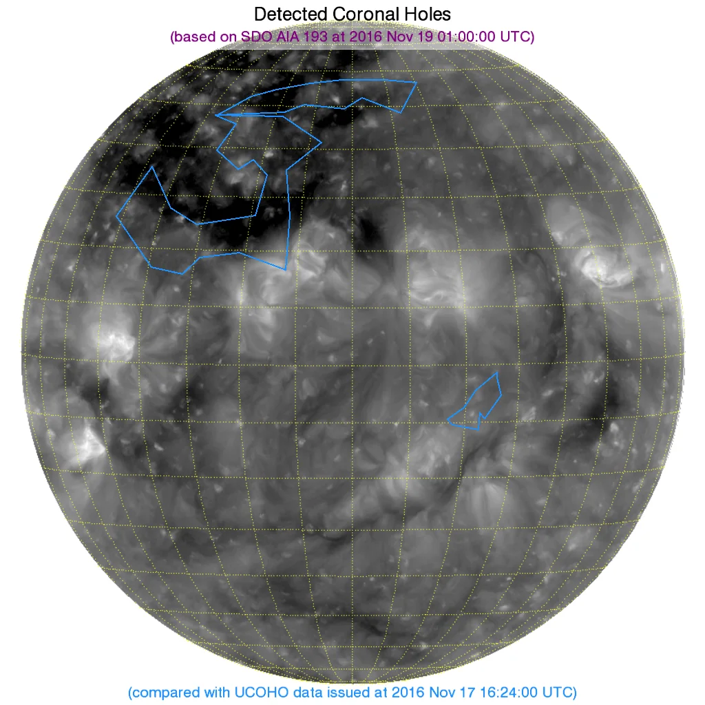 現時点で地球正面の黒点群は、ありません。←黒点番号が振られていない活動領域でもフレアは発生しますので、あくまで目安として捉えてください。