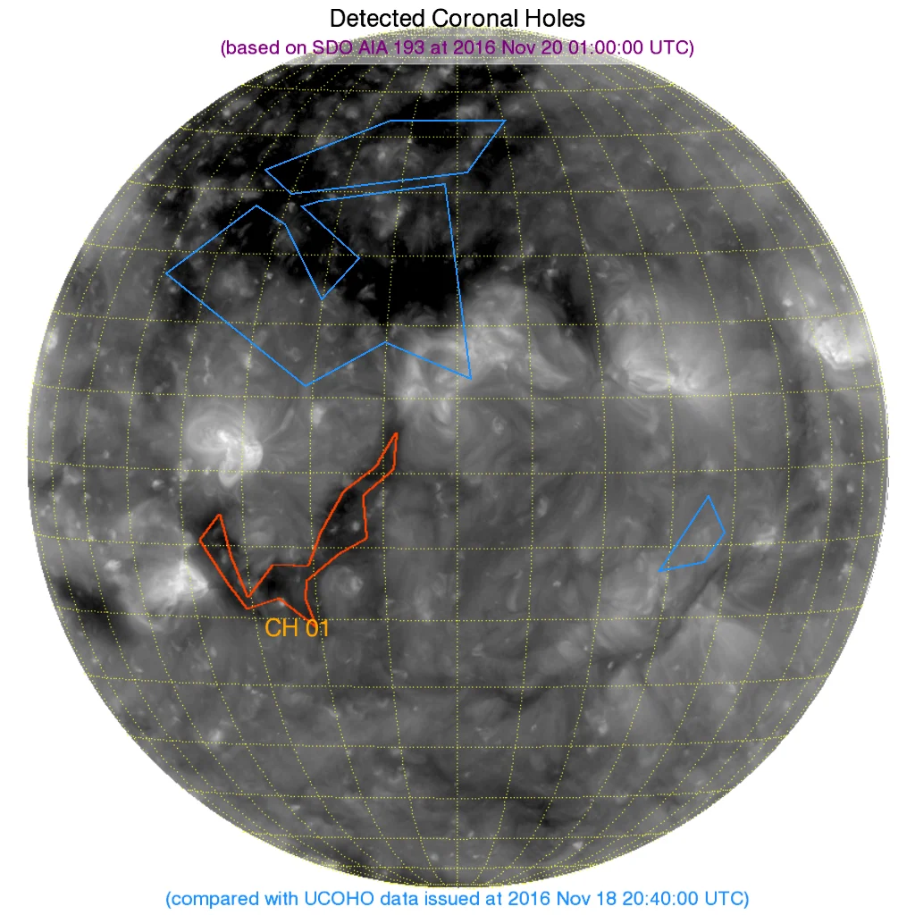 10月下旬に北半球にあった巨大なコロナホールの名残が再び回り込んできたようです。