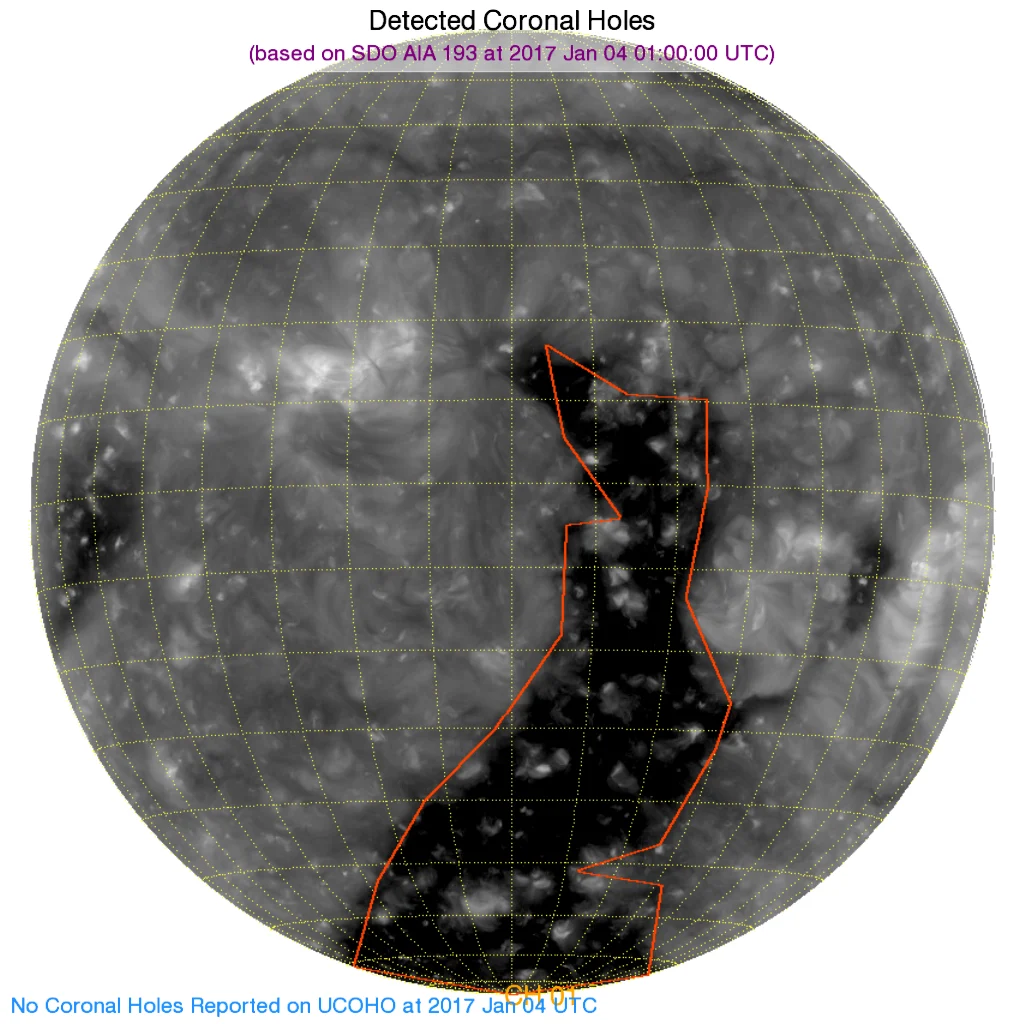 南半球の極から赤道を超えて北半球にまで届く巨大なコロナホールは、やや西寄りへ移動。