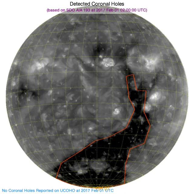 南半球のコロナホールは南の極から赤道を超えたくらいまでの大きさです。更に西へ移動。