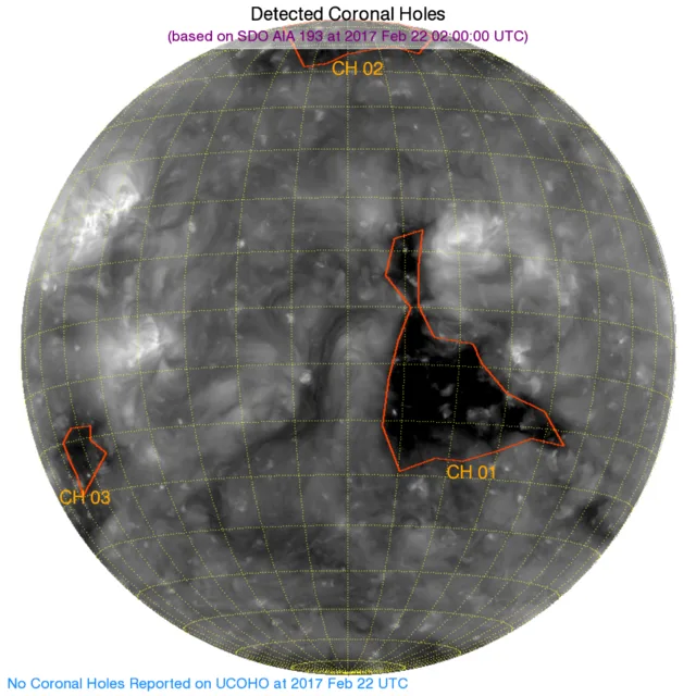 南半球西寄りから西側にかけて広がる大き目なコロナホールがあります。こちらの影響が23日くらいから届き始めるかも。