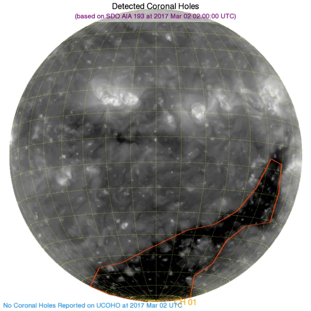 南の極&南半球東寄りから、西端まで広がる巨大なコロナホールがあります。