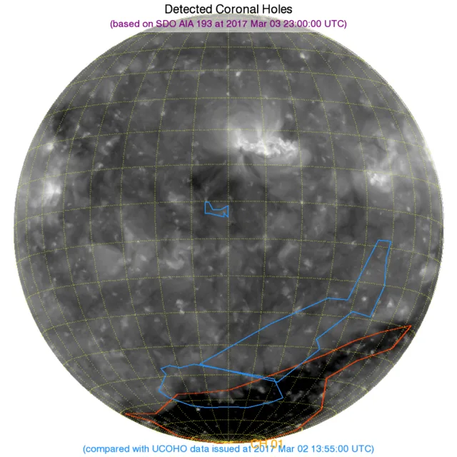 やや縮小しましたが、南の極から西端まで広がる巨大なコロナホールがあります。
