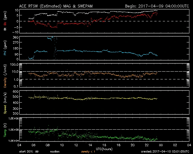 引き続き、500km/s前後で推移しています(時々突風のような速度の速い太陽風が観測されています)。