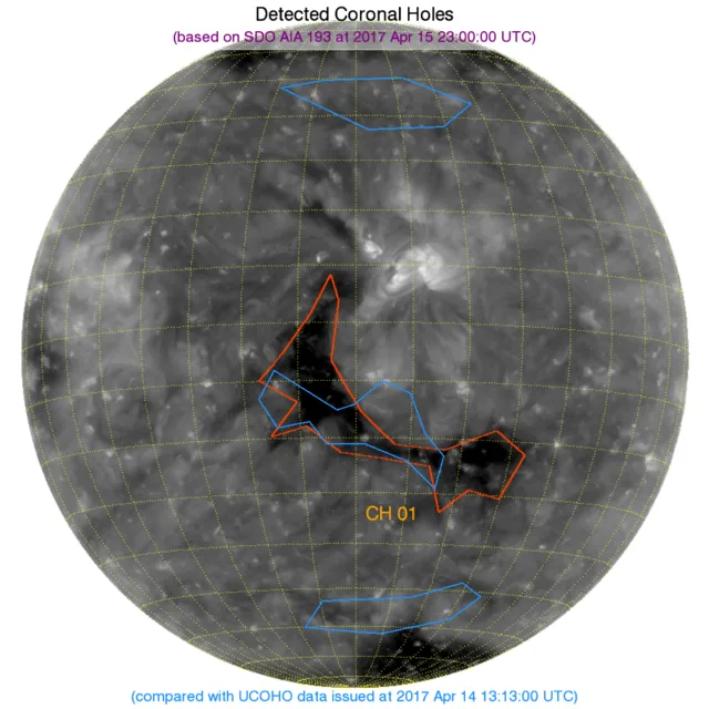 南半球のコロナホールは西寄りまで移動。こちらの影響が16日くらいから届き始めるかも。