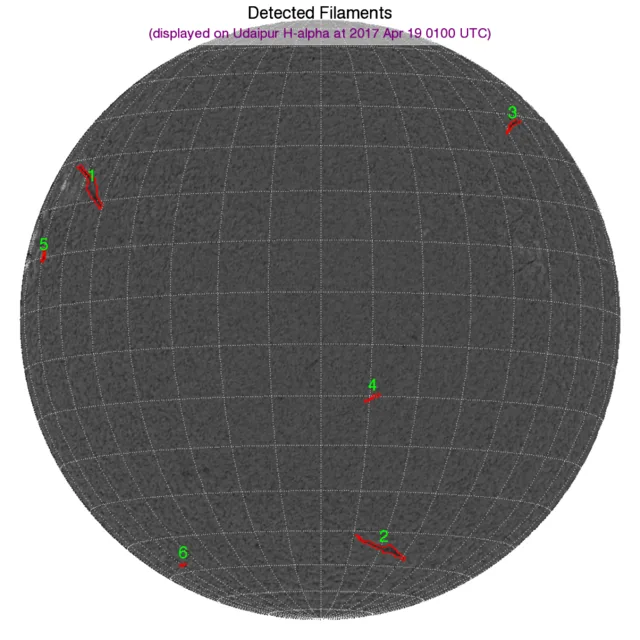 ※フィラメント:南の極付近、南半球西寄り、北半球東端と西端にフィラメントが浮いています。