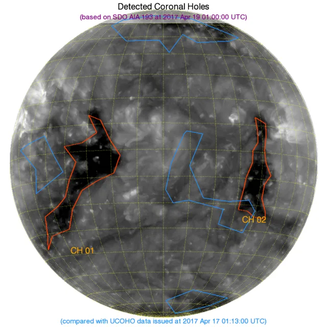 南半球のコロナホールが西側にあります。こちらの影響がそろそろ届き始めるかも。