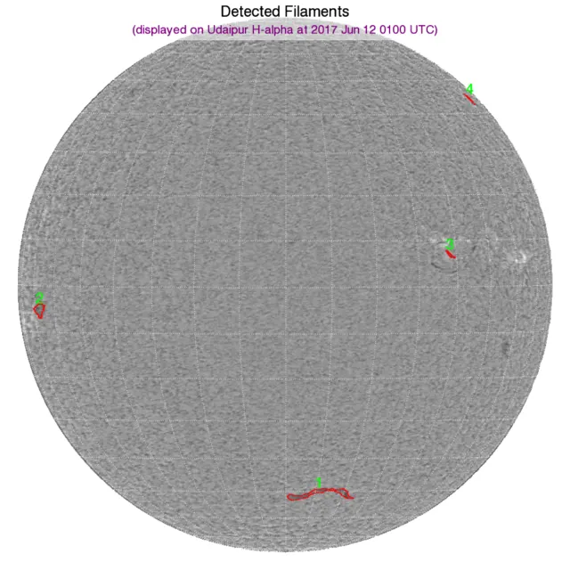 ※フィラメント:南の曲付近にやや長めのフィラメントが浮いています。赤道付近の東端と西側に小さなフィラメントあり。