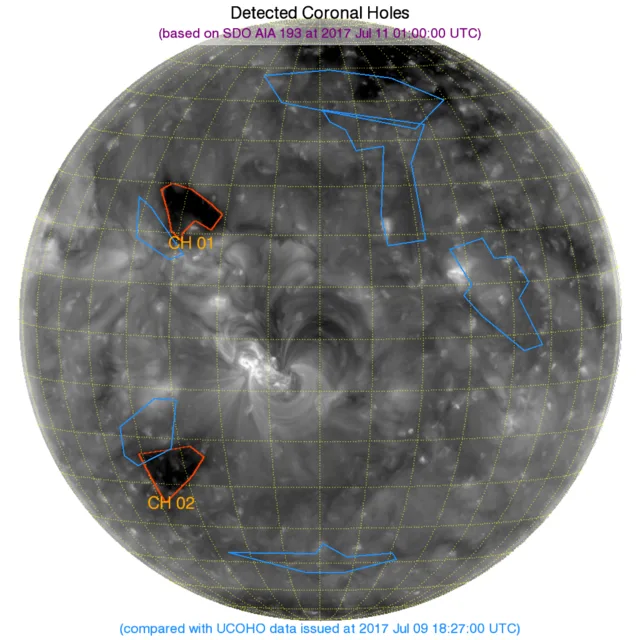北半球西側~西端にあったコロナホールはカウントされなくなりました。現在こちらの影響下。