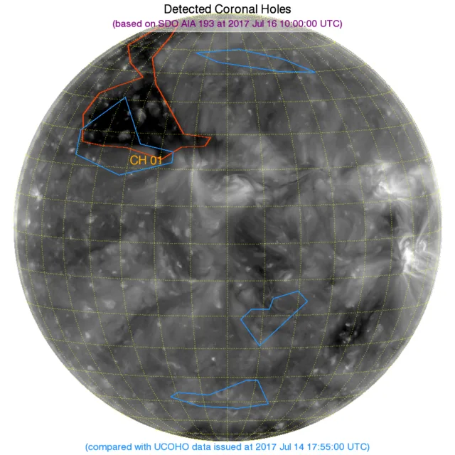 北半球東端のコロナホールは北の極付近まで拡大しています。