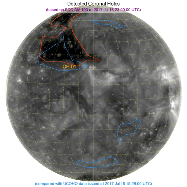 北半球東側から北の極付近まで広がるコロナホールは更に拡大しています。