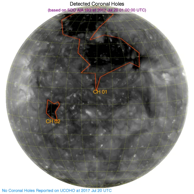 北半球のコロナホールは再び極付近まで拡大しました。ほぼ正面あたりにあります(こちらの影響が21日くらいから届くかも)。
