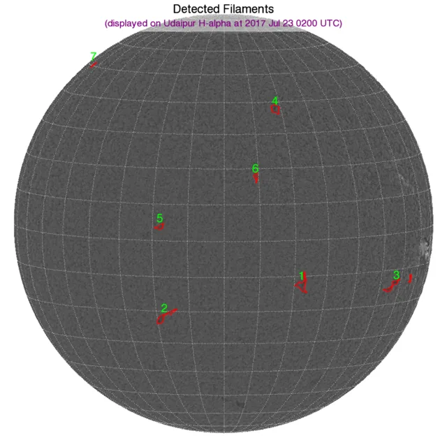 ※フィラメント:南半球西側、北半球西寄り・東寄り、南半球東寄りにフィラメントが浮いています。
